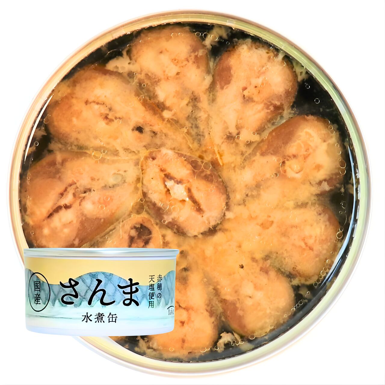 赤穂の天塩を使用し、旬の国産さんまを塩だけでシンプルに仕上げた水煮缶です。