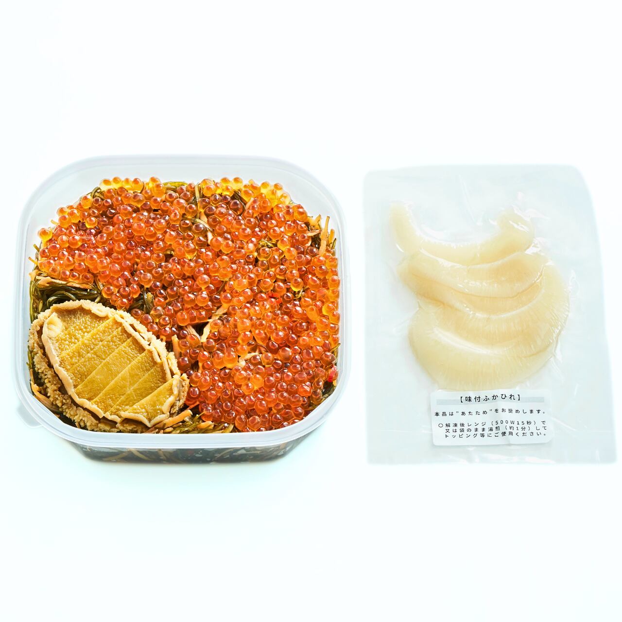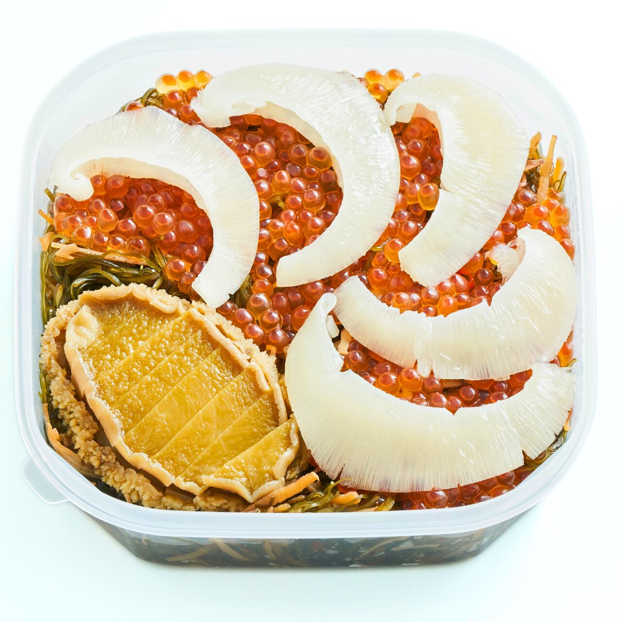 甘めに仕上げた松前漬けに、国産の鮑、イクラ、数の子(ペルー・ロシア産)を贅沢に盛り付け、フカヒレは別添パックで湯煎対応。お召し上がりの直前に加えることで、ふくよかな香りととろけるような食感を存分にご堪能いただけます。