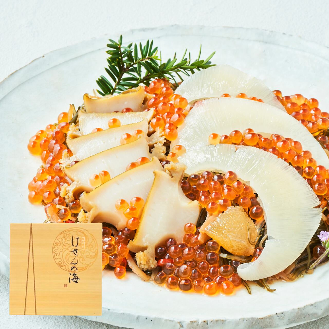 「けせんの海 金印」は、陸前高田の豊かな海から届けられる極上の素材を惜しみなく使用した、シリーズ最高峰の逸品です。