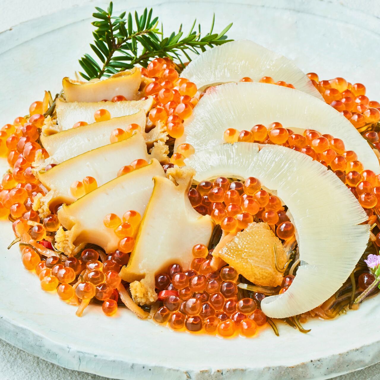 やわらかな鮑、濃厚なフカヒレ、弾けるイクラ、歯ごたえの良い数の子が織りなす、味と食感の豊かな調和。