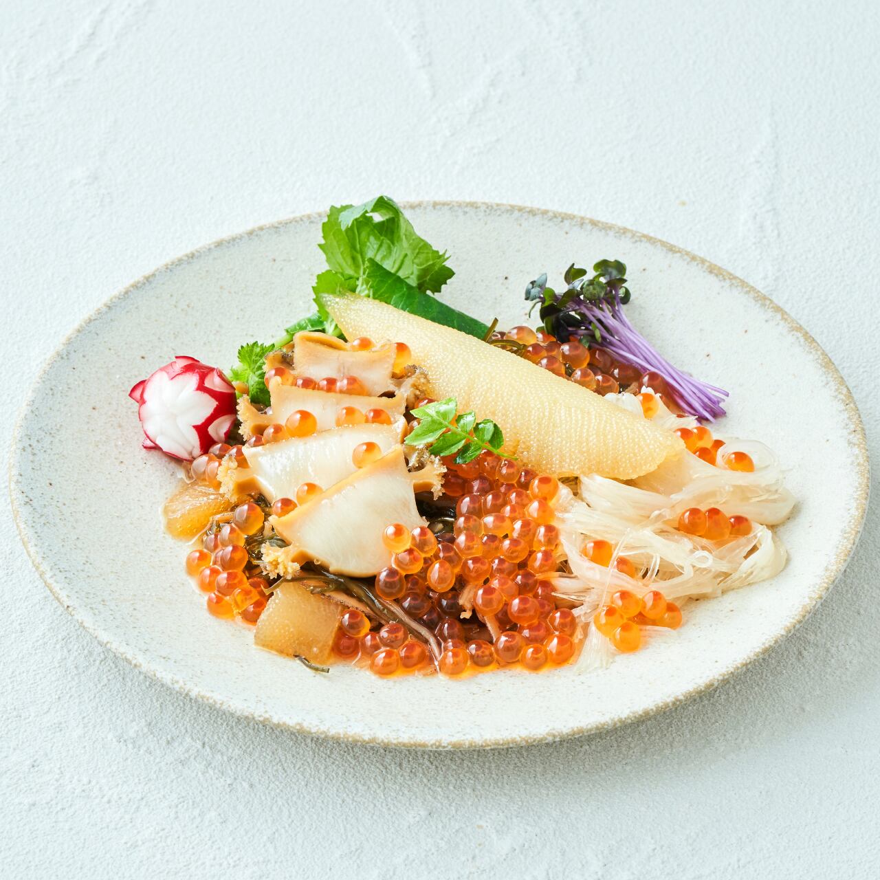 甘めに仕上げた味付けの松前漬けをベースに、やわらかな国産鮑、プチプチとしたイクラ、そしてペルー・ロシア産の良質な数の子を合わせ、食感と旨みのバランスにこだわりました。